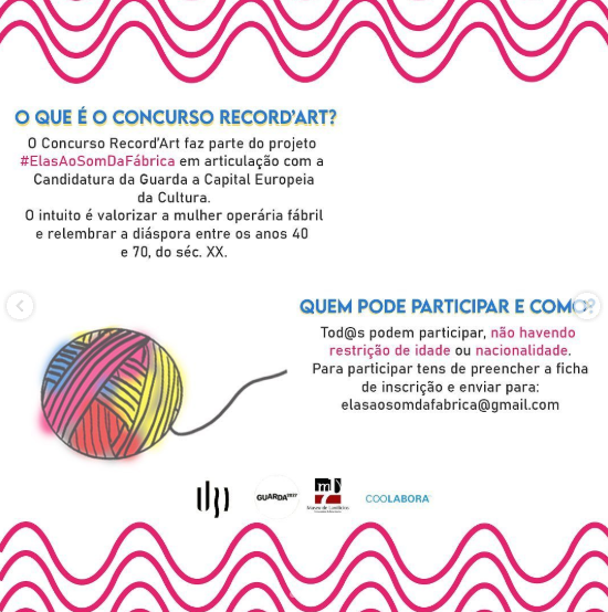 Até ao dia 2 de junho está aberto o concurso Record’Art, inserido no projeto #ElasAoSomDaFábrica, organizado pela turma finalista de Ciências da Cultura da UBI, em parceria com a Candidatura da Guarda a Capital Europeia da Cultura, Universidade da Beira Interior, Museu de Lanifícios e CooLabora.